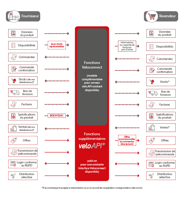 Un serveur Veloconnect de velo.API sert de plateforme centrale pour tous les échanges de données. Il fournit toutes les fonctions essentielles nécessaires à une communication fluide entre les détaillants et les fournisseurs, permettant une connexion simple, sécurisée et automatisée entre différents systèmes, par exemple entre le système ERP d’un fournisseur et celui d’un détaillant.